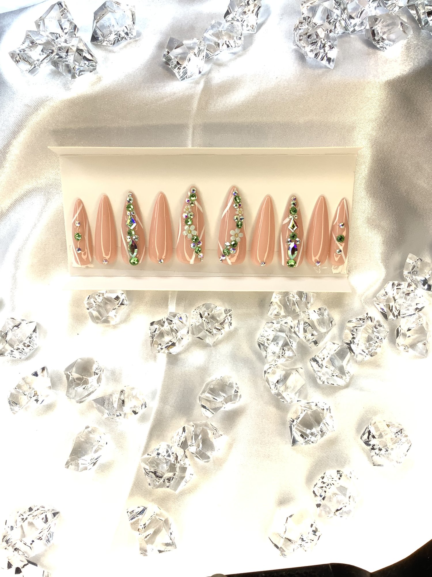 Each set contains a set of (10 False Nails) 2 Thumbs, 2 Pointers, 2 Middle, 2 Rings, 2 Pinkies